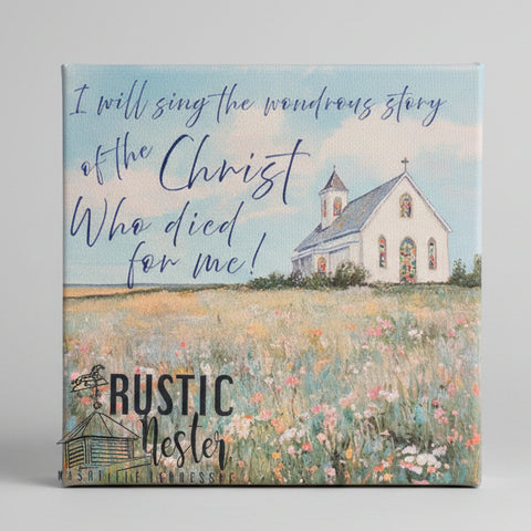 I will sing the Wondrous story of the Christ who died for me canvas art block. Canvas is printed using high end fade resistant ink. Canvas is wrapped around a wooden frame with a 1.5" unprinted raised edge.