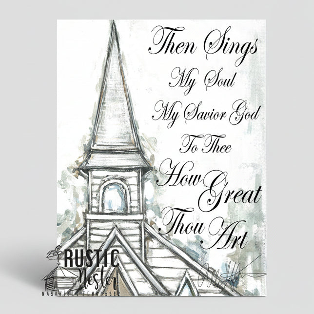 Old church song How Great Thou Art with old church steeple. Canvas print is stretched across a lightweight wooden frame with a 1/2" unprinted raised edge.